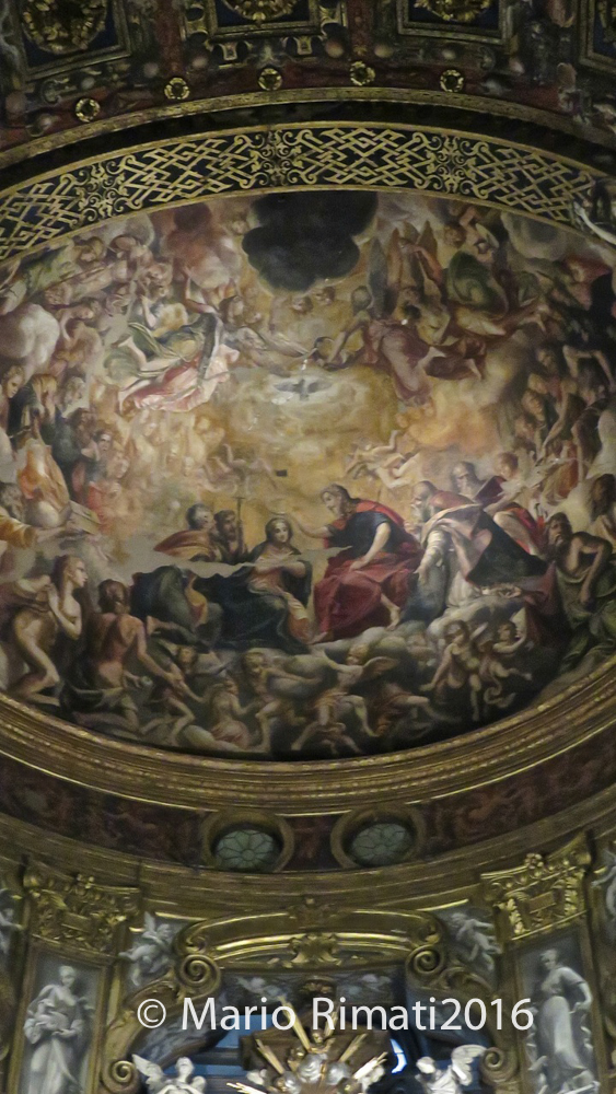 a late Mannerist façade and a belltower designed by Simone Moschino. The cupola is frescoed with an influential